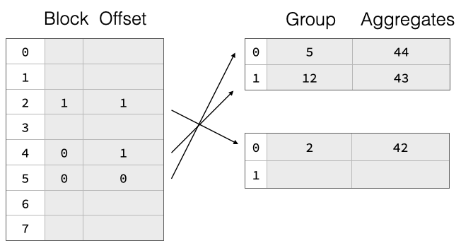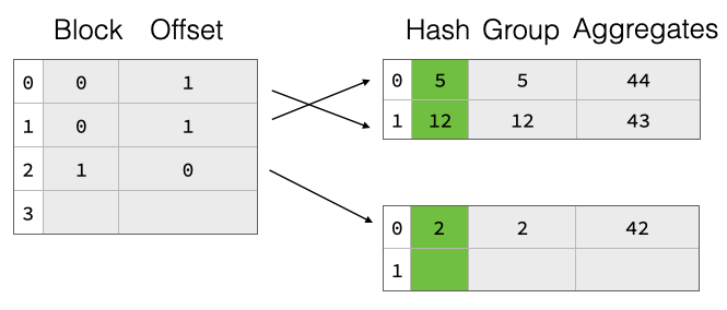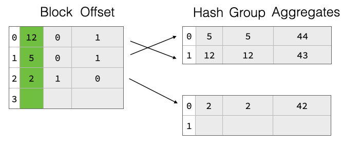 Both chaining and linear probing will degrade in theoretical lookup performance from O(1) to O(n) wrt hash table size if there are too many collisions, i.e., too many groups hashing to the same hash table entry. A common solution to this problem is to resize the hash table once the “fill ratio” exceeds some threshold, e.g., 75% is the default for Java’s HashMap. This is particularly important as we do not know the amount of groups in the result before starting the aggregation. Neither do we assume to know the amount of rows in the input table. We thus start with a fairly small hash table and resize it once the fill ratio exceeds a threshold. The basic hash table structure is shown in the figure below, the table has four slots 0-4. There are already three groups in the table, with group keys 12, 5 and 2. Each group has aggregate values (e.g., from a SUM) of 43 etc.